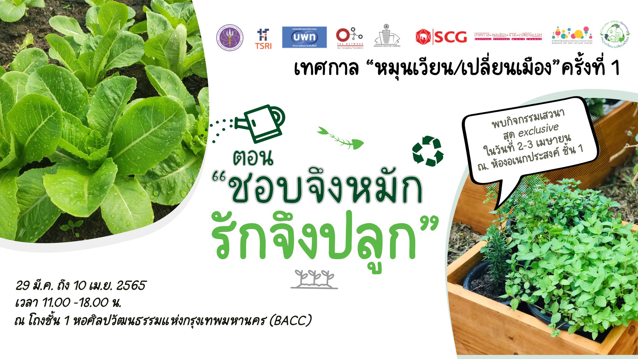 ✨นอกจากนี้ ยังมีกิจกรรมเสวนาสุดพิเศษ ร่วมกับผู้สมัครลงเลือกตั้งผู้ว่ากรุงเทพฯ และแขกรับเชิญอีกมากมายที่ให้ความสนใจด้านเกษตรอินทรีย์และสิ่งแวดล้อมของประเทศไทย อาทิ คุณชัชชาติ สิทธิพันธุ์ คุณรสนา โตสิตระกูล คุณวนิษา เรซ (หนูดี) และดร. พสุต รัตนบรรณางกูร ในวันเสาร์ที่ 2 และวันอาทิตย์ที่ 3 เมษายน 2565 อีกด้วย