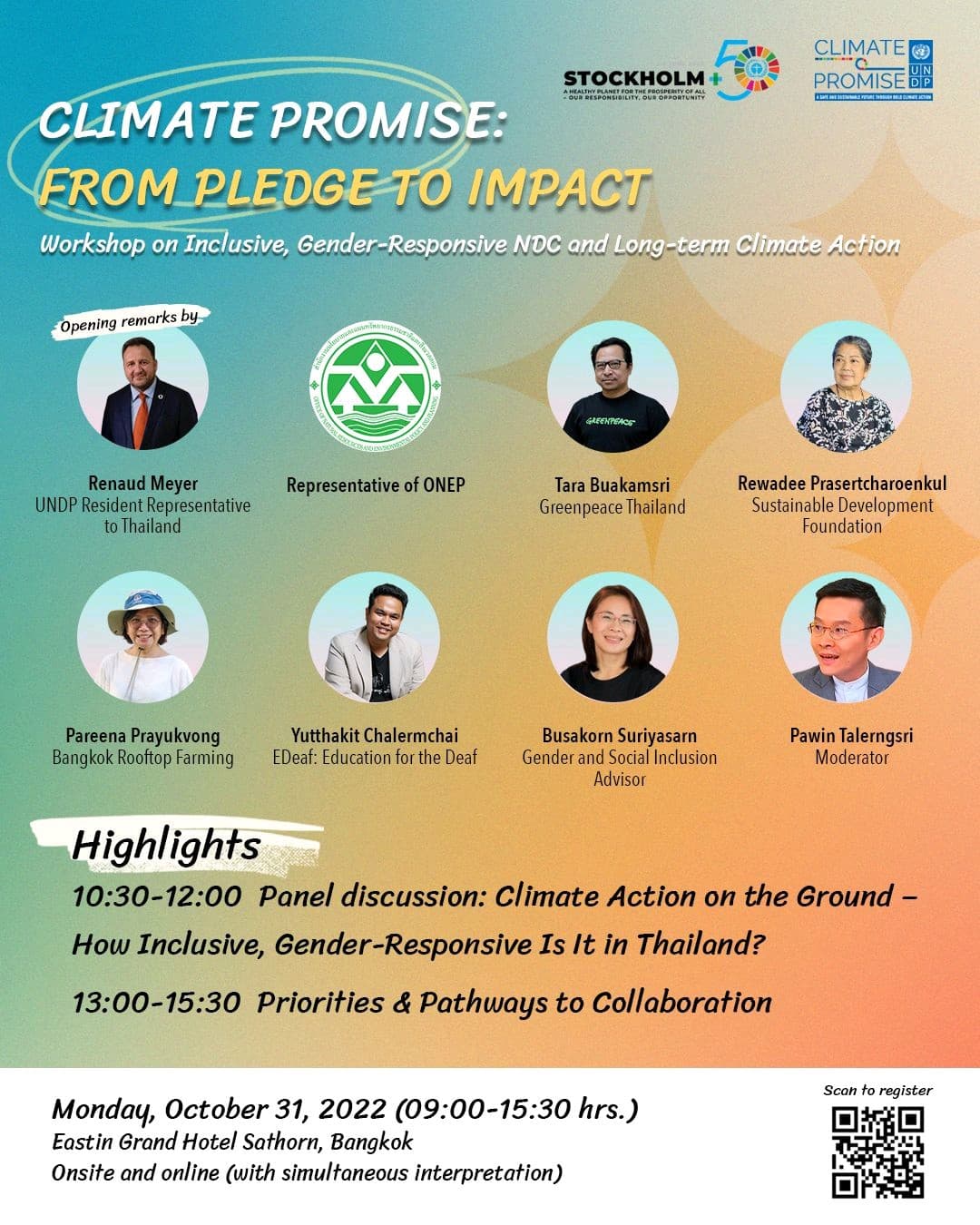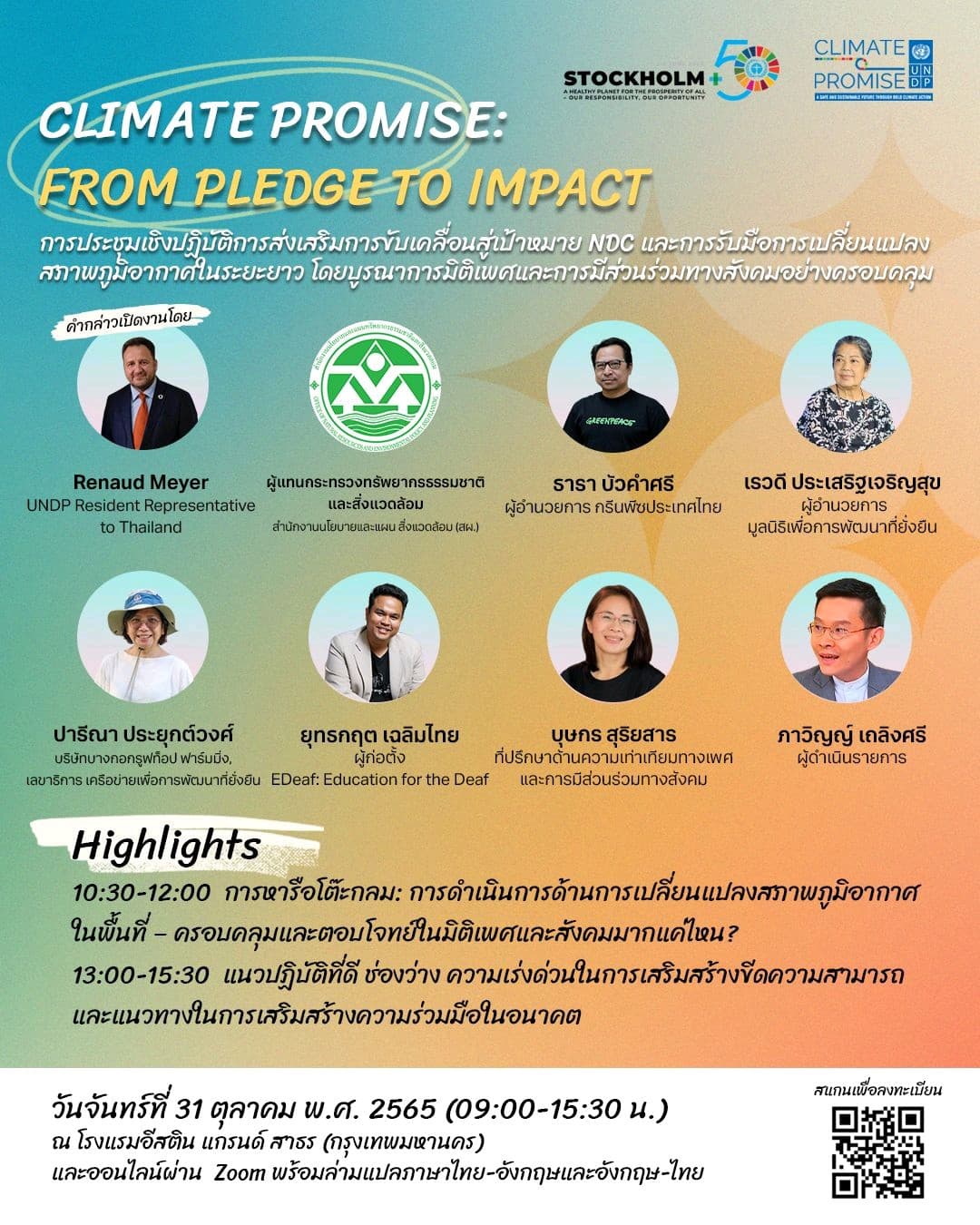 ขอเรียนเชิญเข้าร่วมการประชุมเชิงปฏิบัติการ “ส่งเสริมการขับเคลื่อนสู่เป้าหมาย NDC และการรับมือการเปลี่ยนแปลงสภาพภูมิอากาศในระยะยาว โดยบูรณาการมิติเพศและการมีส่วนร่วมทางสังคมอย่างครอบคลุม” เป็น การเสริมพลังความร่วมมือเพื่อเปลี่ยนคำมั่นสู่ผลสัมฤทธิ์ด้านการเปลี่ยนแปลงสภาพภูมิอากาศ โดยการสนับสนุนจากรัฐบาลประเทศสวีเดน เป็นส่วนหนึ่งของความร่วมมือระหว่างโครงการพัฒนาแห่งสหประชาชาติ (UNDP) กับประเทศไทย ผ่านกระทรวงทรัพยากรธรรมชาติและสิ่งแวดล้อม (ทส.) ภายใต้แผนงานความร่วมมือ Climate Promise หรือ คำมั่นสัญญาด้านการเปลี่ยนแปลงสภาพภูมิอากาศ มีเป้าหมายเสริมสร้างความเป็นเจ้าของและการมีส่วนร่วมของสังคม รวมถึงผู้มีส่วนได้ส่วนเสียที่เกี่ยวข้องทุกภาคส่วน เพื่อมุ่งสร้างฉันทามติขยายผลการดำเนินงานของแผนการมีส่วนร่วมที่ประเทศกำหนด อย่างครอบคลุมและคำนึงถึงมิติเพศภาวะ นอกจากนี้ ยังมุ่งขยายแนวทางดำเนินงานด้านการเปลี่ยนแปลงสภาพภูมิอากาศอย่างมีส่วนร่วมของสังคม โดยสนับสนุนการพัฒนาแนวทางและกระบวนการกำหนดนโยบาย แผนงานโครงการ และงบประมาณด้านการเปลี่ยนแปลงสภาพภูมิอากาศที่คำนึงถึงมิติทางเพศ ความร่วมมือของภาคเอกชน การเสริมสร้างศักยภาพและการถ่ายทอดเทคโนโลยี เพื่อดำเนินงานด้านการลดการปล่อยก๊าซเรือนกระจก และการปรับตัวต่อผลกระทบจากการเปลี่ยนแปลงสภาพภูมิอากาศที่จะนำไปสู่การพัฒนาประเทศที่ปล่อยก๊าซเรือนกระจกต่ำและมีความสามารถในการรับมือกับการเปลี่ยนแปลงสภาพภูมิอากาศสู่การพัฒนาที่ยั่งยืน